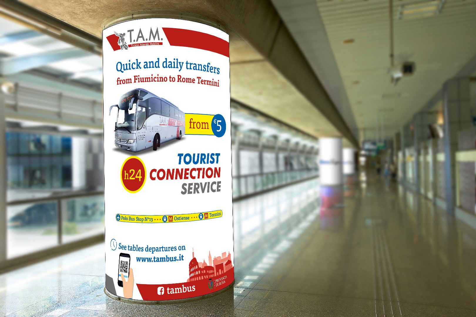 Abbiamo ideato e realizzato la campagna pubblicitaria affissionale all’interno dell’aeroporto di Fiumicino per TAM Bus, azienda di trasporto pubblico.